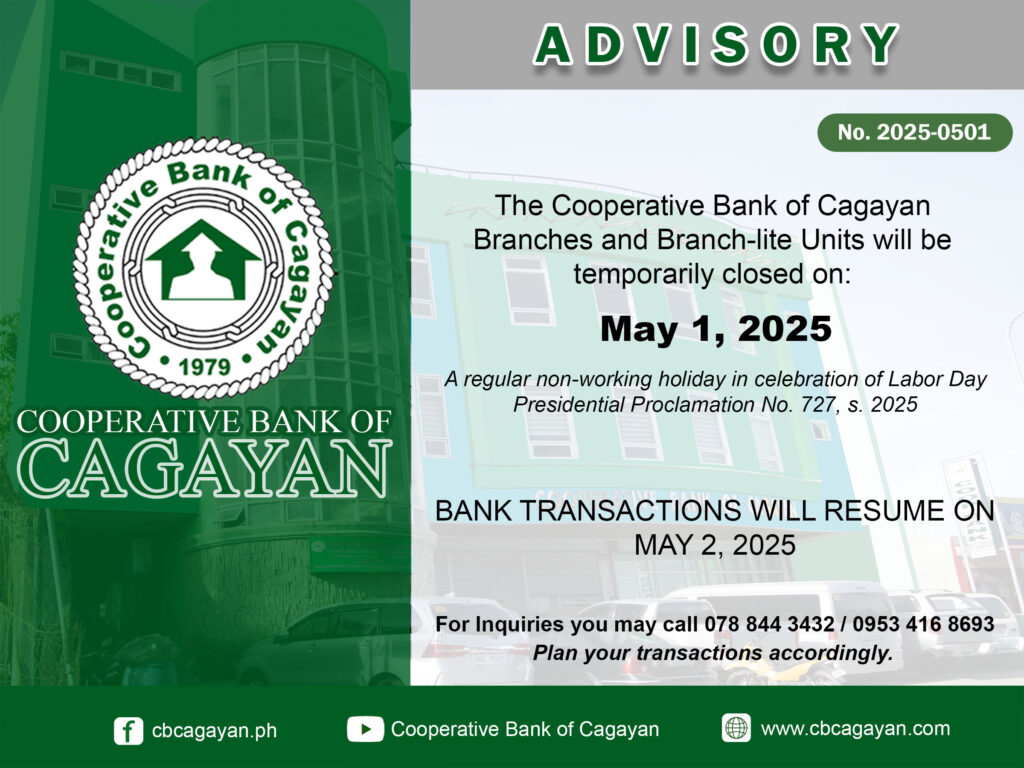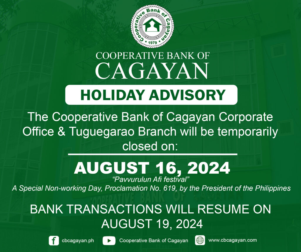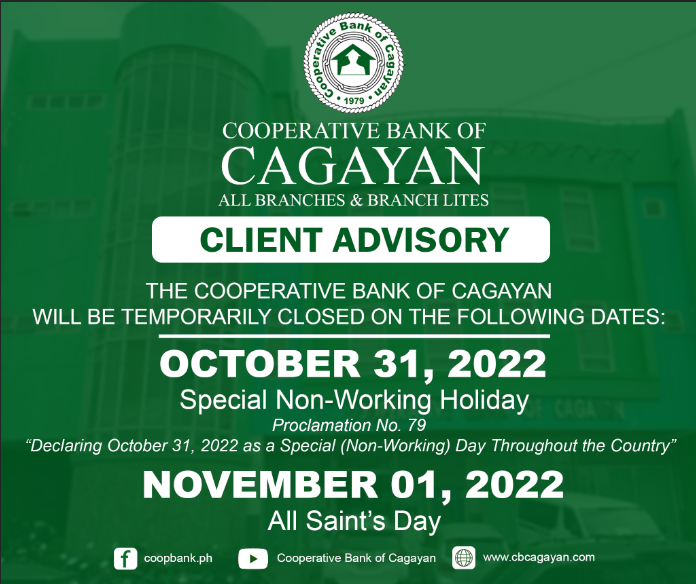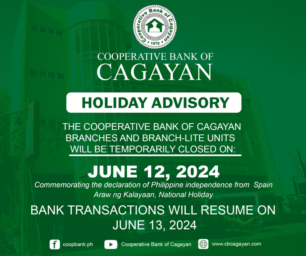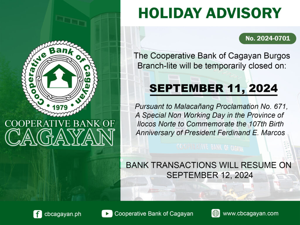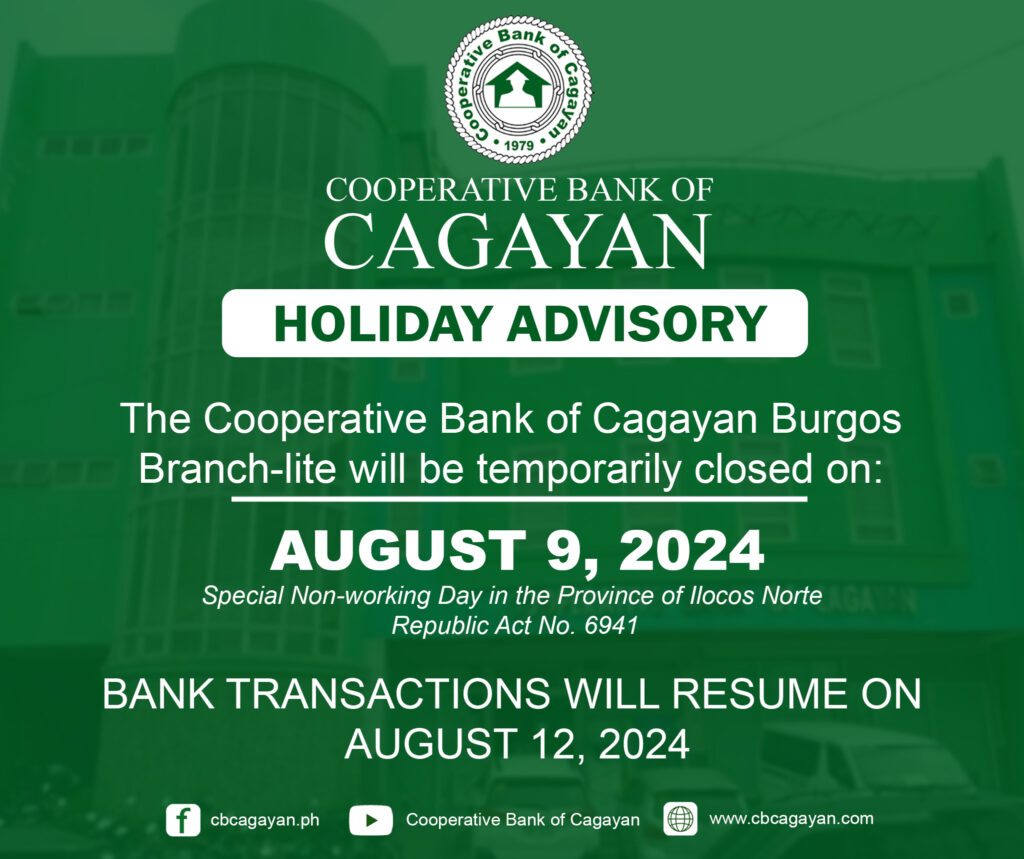 In observance of the National Heroes Day, Cooperative Bank of Cagayan will be temporarily closed on Monday, August 29, 2022.