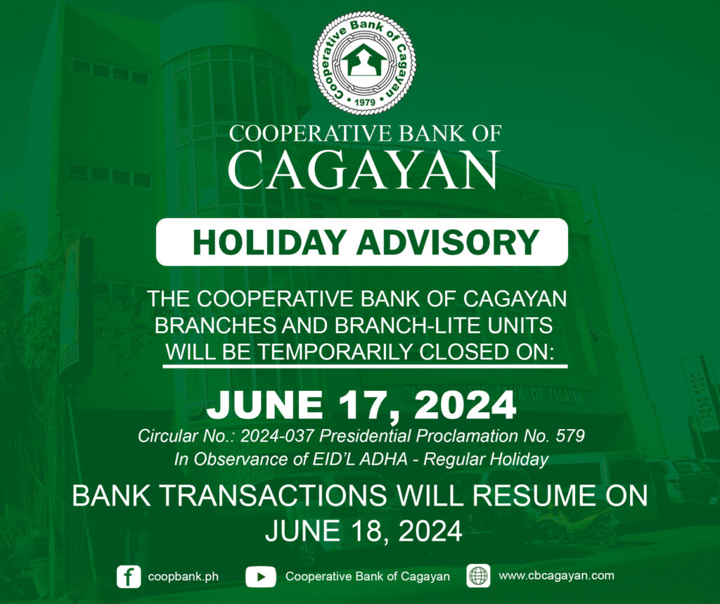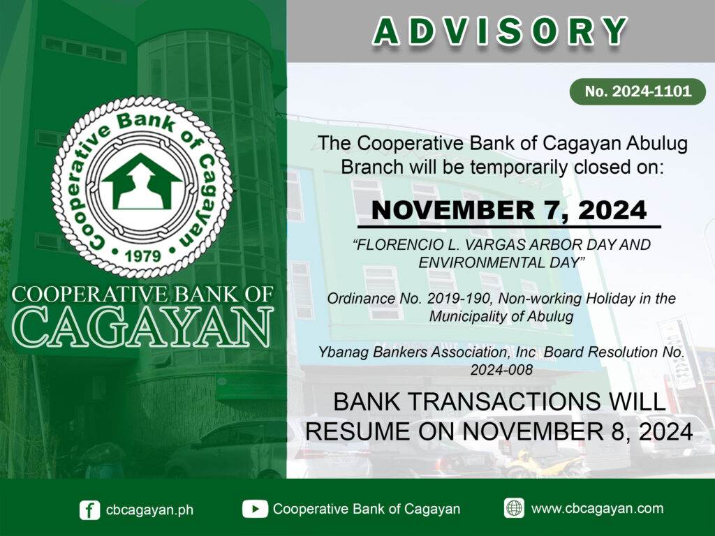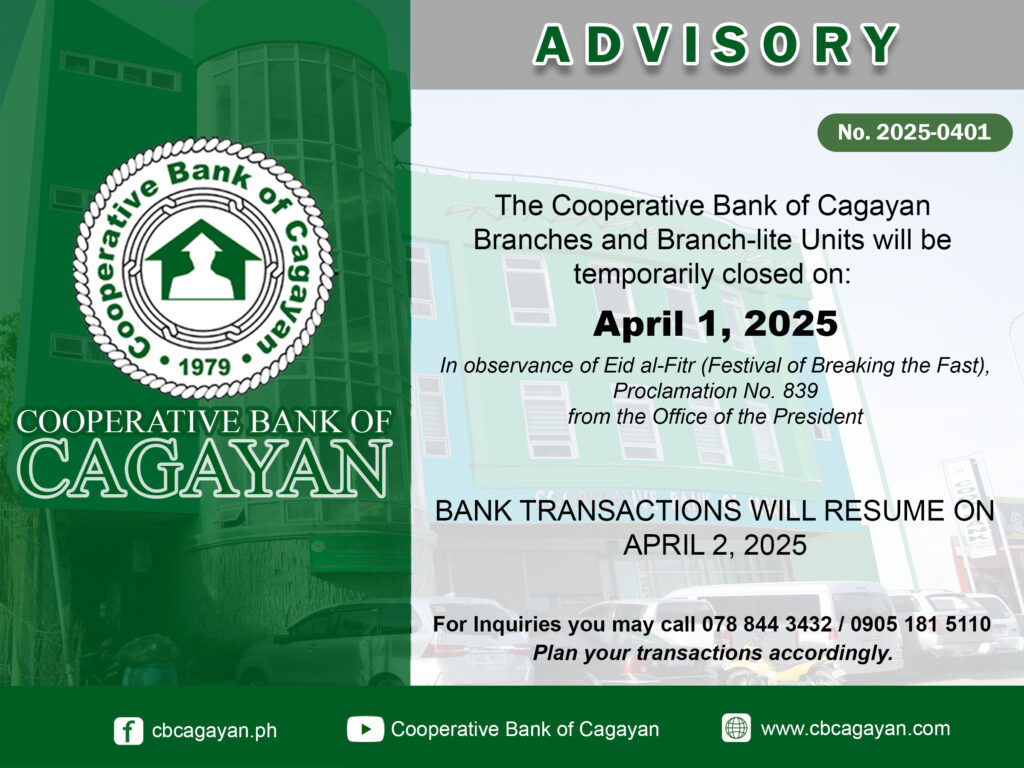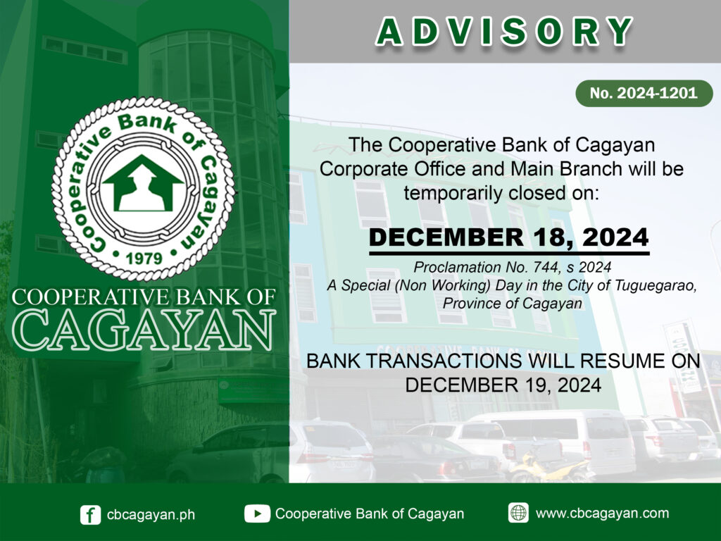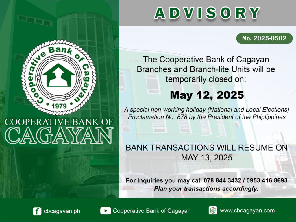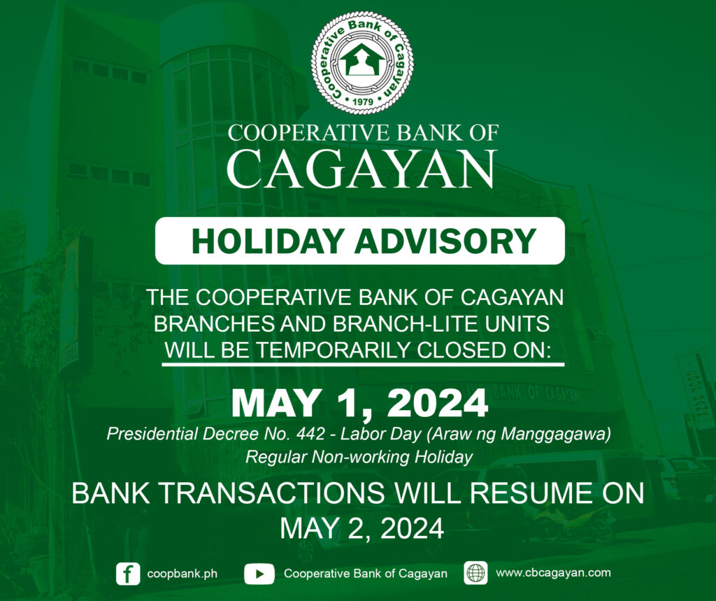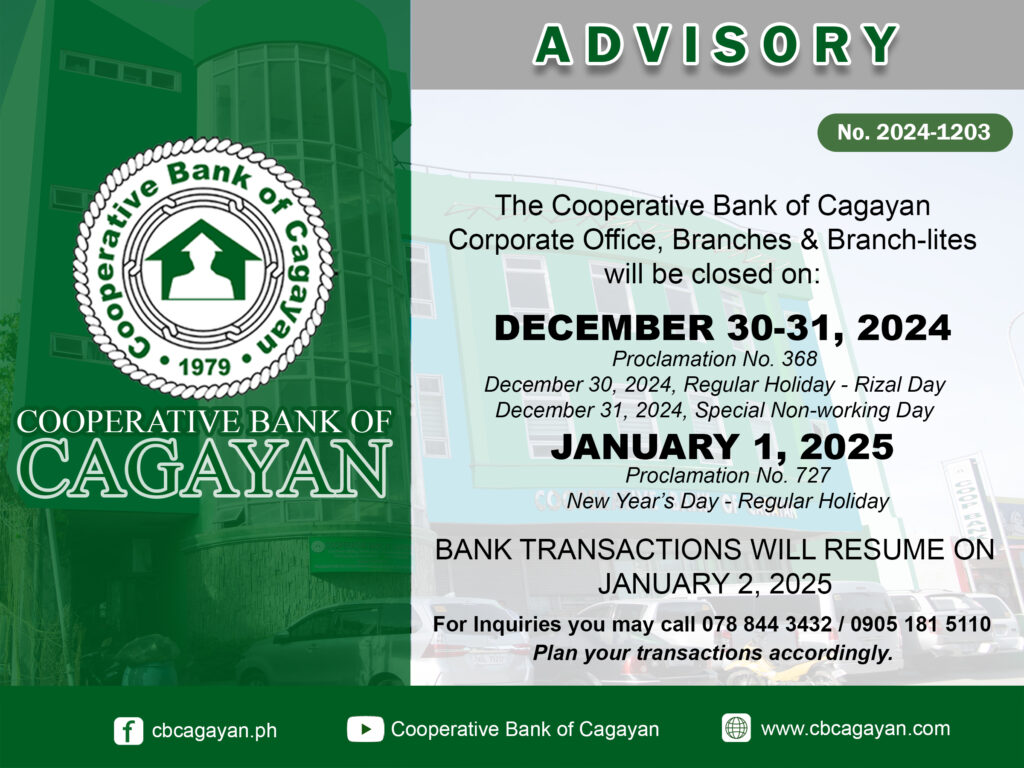 In observance of the National Heroes Day, Cooperative Bank of Cagayan will be temporarily closed on Monday, August 29, 2022.