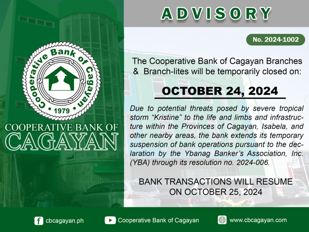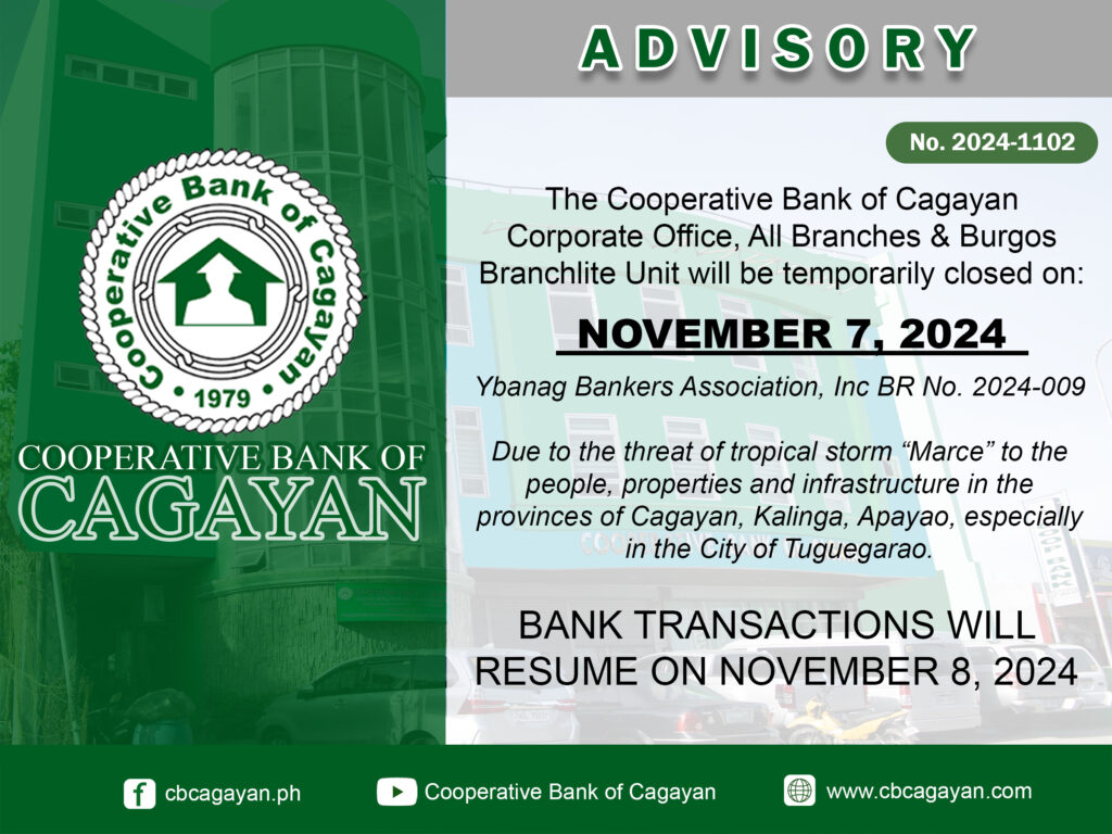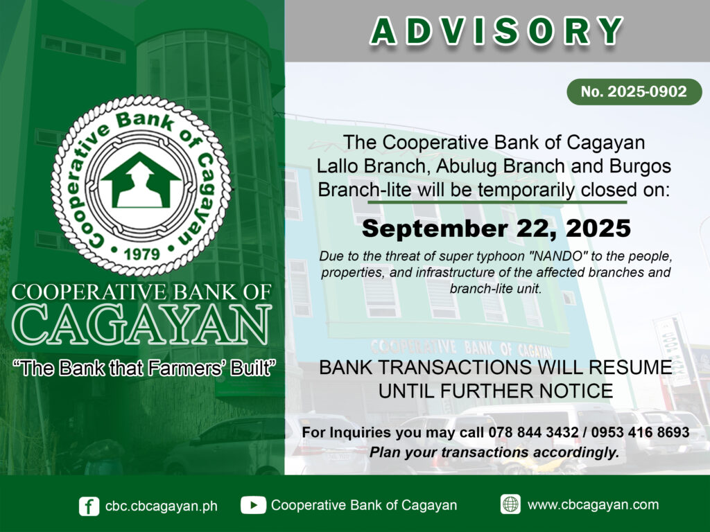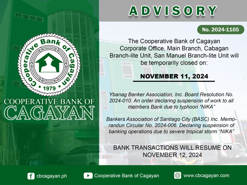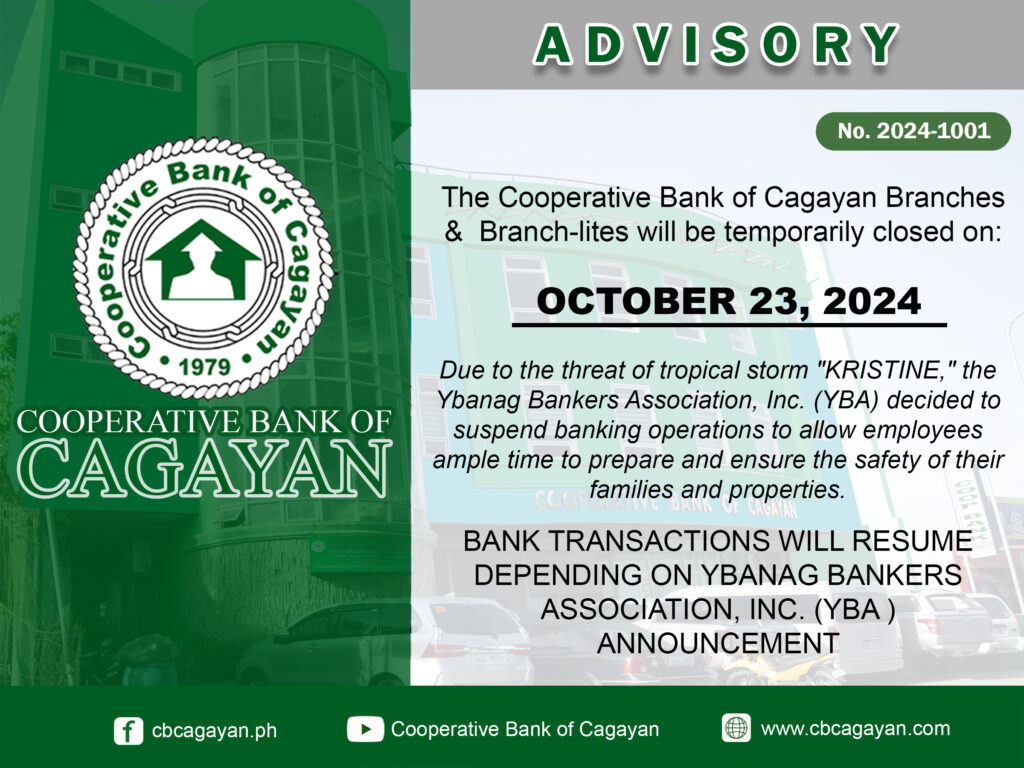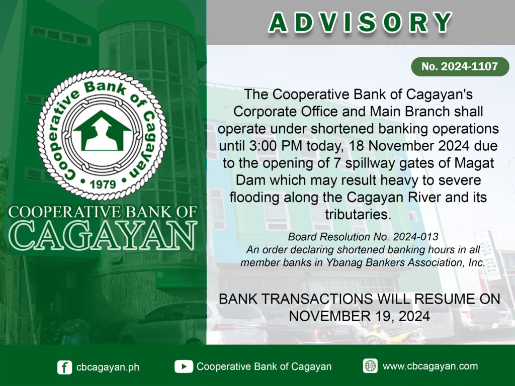 In observance of the National Heroes Day, Cooperative Bank of Cagayan will be temporarily closed on Monday, August 29, 2022.