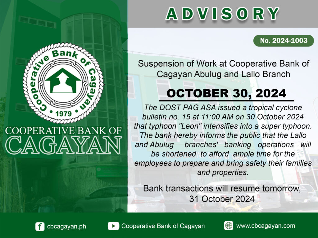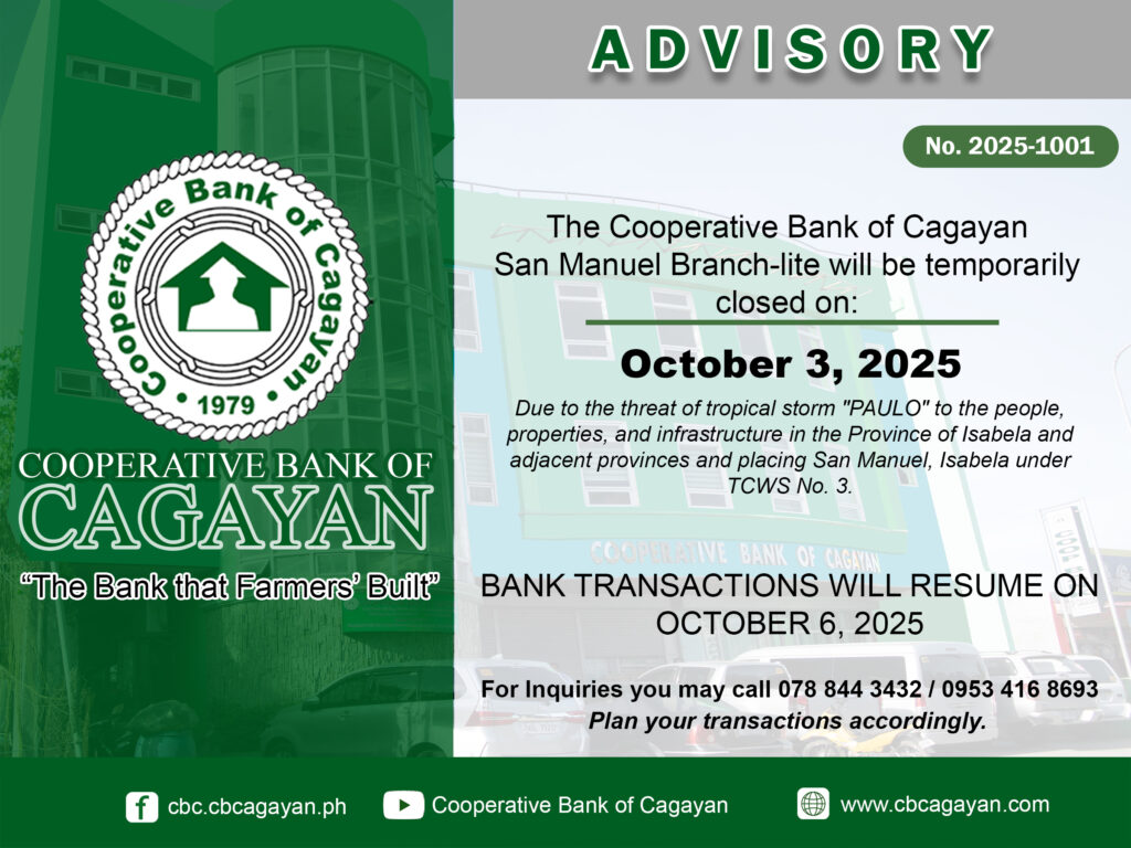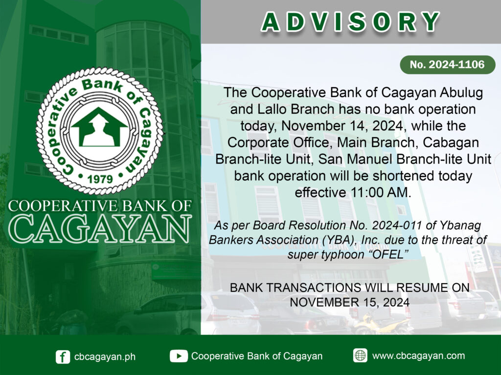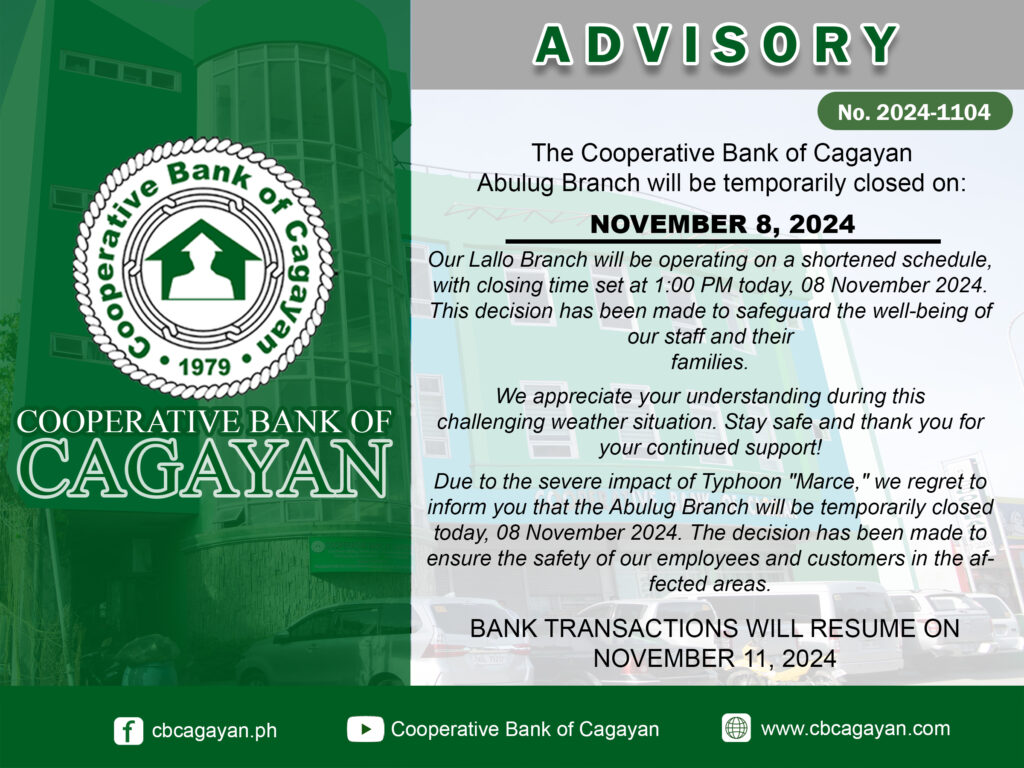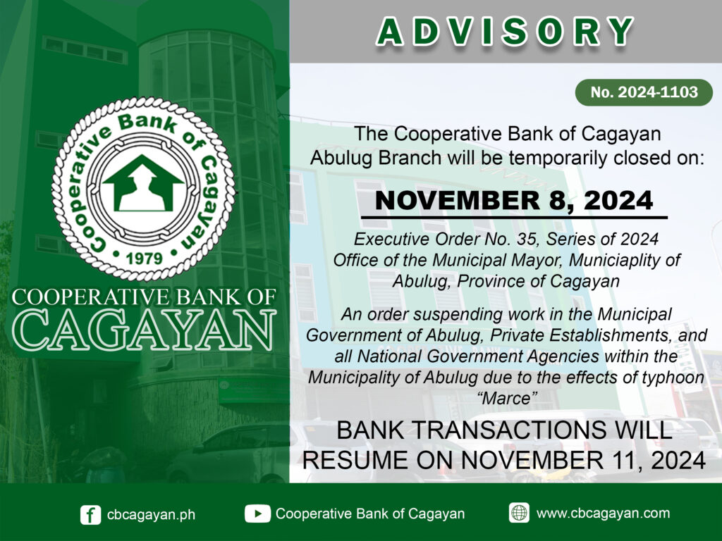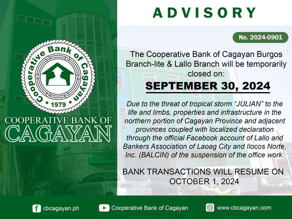 In observance of the National Heroes Day, Cooperative Bank of Cagayan will be temporarily closed on Monday, August 29, 2022.