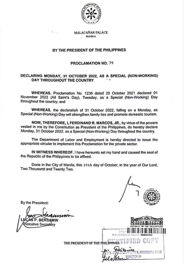 President Ferdinand “Bongbong” Marcos Jr. has declared Oct. 31, 2022, a special non-working holiday, Malacañang announces. Office of the Press Secretary OIC Cheloy Garafil says President Marcos signed today the proclamation declaring Oct. 31 as a special non-working holiday.
