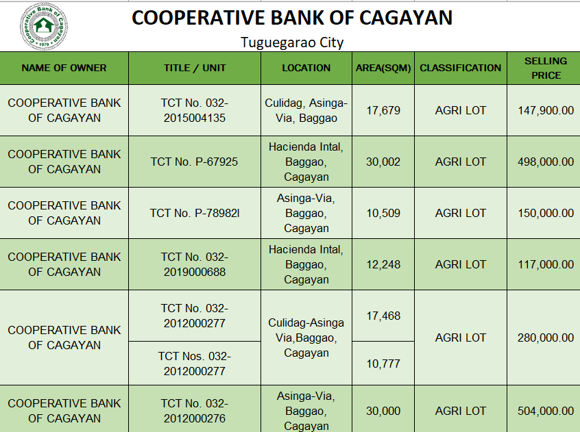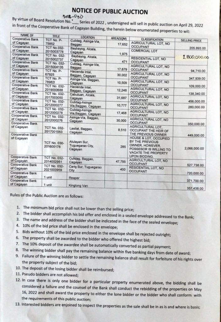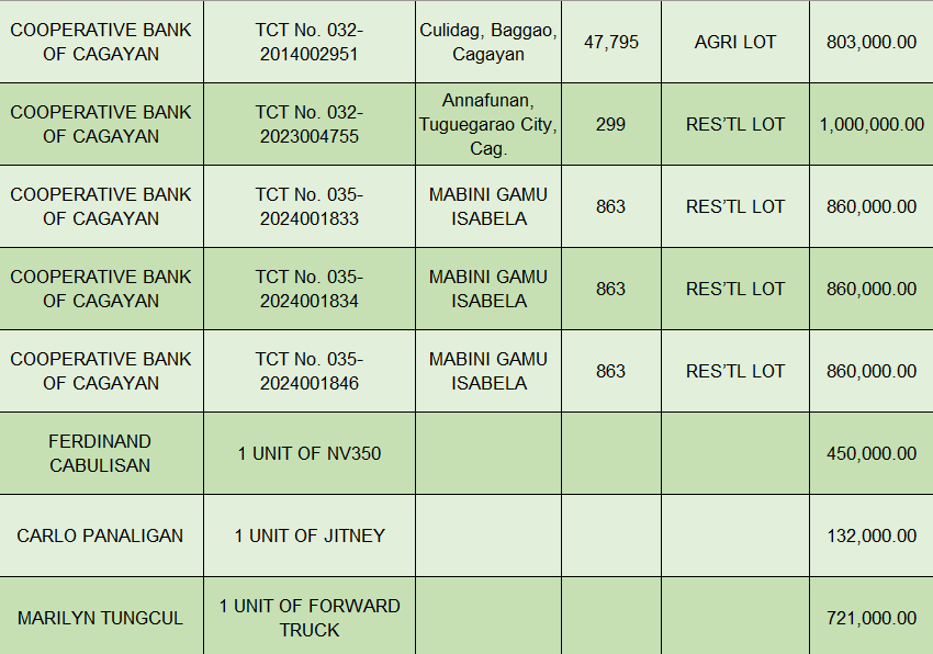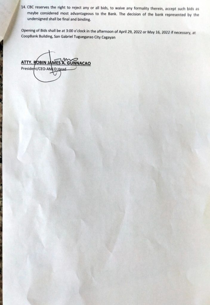 Opening of Bids shall be at 3:00 o’clock in the afternoon of October 10, 2024 or October 25, 2024 if necessary, at CoopBank Building, San Gabriel Tuguegarao City Cagayan
