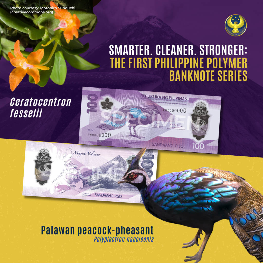 The 100-piso polymer banknote highlights the majestic Palawan peacock-pheasant together with Ceratocentron fesselii—an endemic and critically endangered orchid in the Philippines.