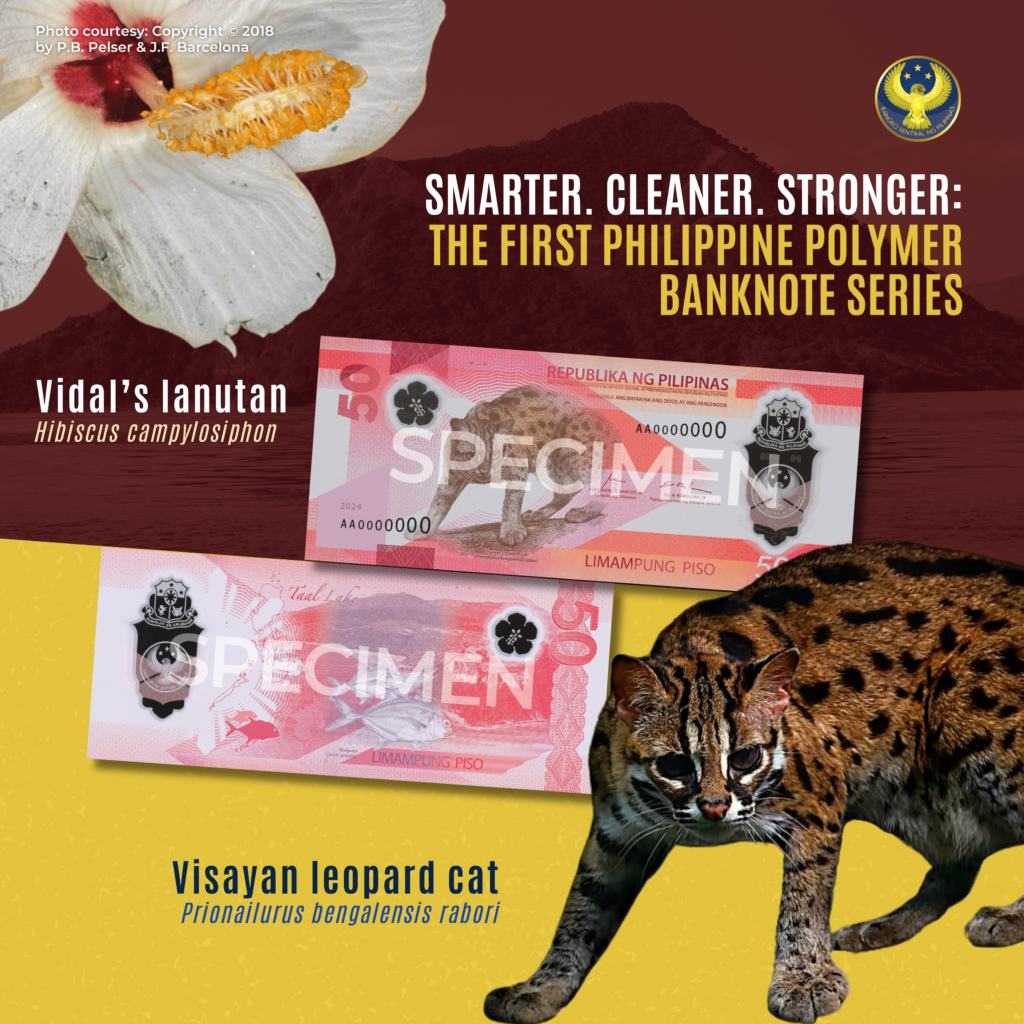 The 50-piso polymer banknote showcases another endemic and threatened flora and fauna in the Philippines—the Visayan leopard cat and Vidal’s lanutan.