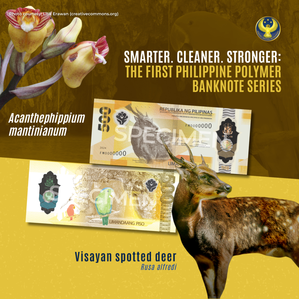 The 500-piso polymer banknote also features a pair of endemic and threatened flora and fauna in the Philippines—the Visayan spotted deer and Acanthephippium mantinianum.